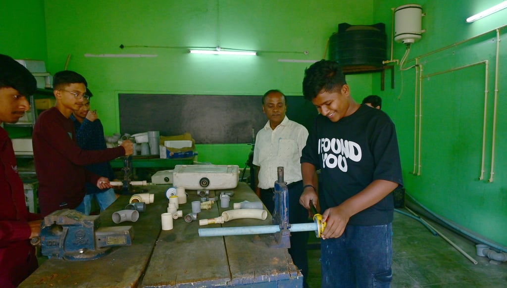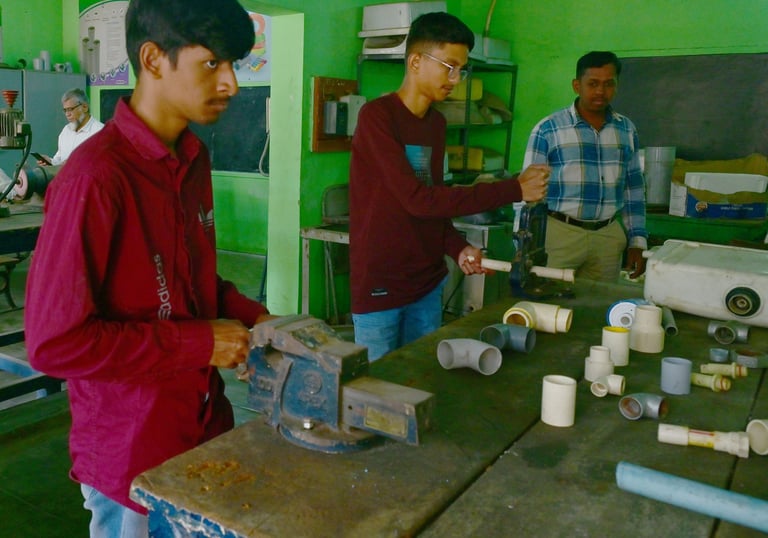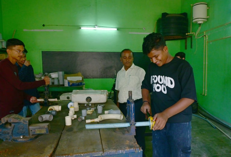 The training program emphasizes hands-on practical experience through workshop and site-oriented learning. ITI trainees are trained in cutting, threading, bending, jointing, and installation of different types of pipes such as PVC, GI, copper, and PPR. They gain experience in fixing sanitary ware, water heaters, pumps, and drainage systems, as well as in detecting leaks, clearing blockages, and performing maintenance work. This practical exposure helps trainees develop technical skill, accuracy, and confidence to handle real-world plumbing tasks independently.