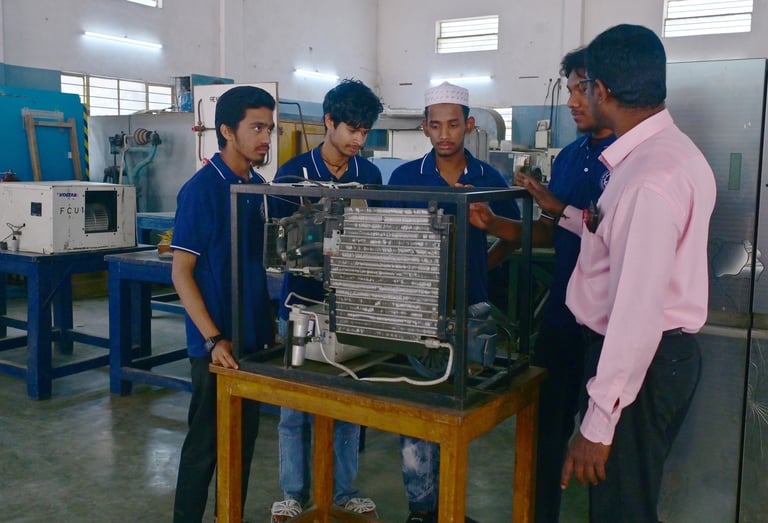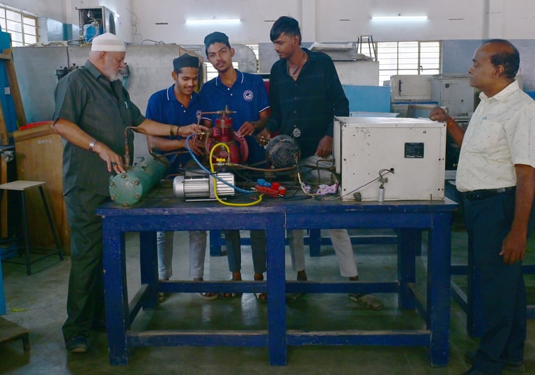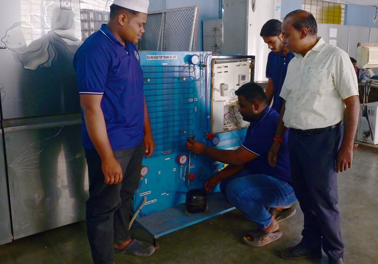 The training program strongly emphasizes hands-on practical learning through well-equipped workshops. ITI trainees gain experience in installing, testing, operating, servicing, and maintaining different types of refrigeration and air conditioning systems, including domestic refrigerators, split and window air conditioners, water coolers, and cold storage units. They are trained in fault diagnosis, troubleshooting, refrigerant charging, brazing, leak detection, and electrical controls associated with RAC systems. This practical exposure builds confidence and prepares trainees to handle real-world technical challenges independently or as part of a service team.